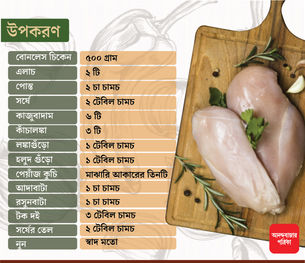 প্রণালী : প্রথমে মিক্সিতে সর্ষে, পোস্ত, কাজুবাদাম, কাঁচা লঙ্কা অল্প জল দিয়ে বেটে নিন। যে পাত্রে আপনি ভাপা চিকেন বসাবেন সেই পাত্রে লঙ্কা গুঁড়ো, হলুদ গুঁড়ো, টক দই, সর্ষের তেল এবং স্বাদ মতো নুন দিন। সঙ্গে যোগ করুন বাটা মশলাগুলোও। এ বার সব একসঙ্গে ভাল করে মিশিয়ে তার মধ্যে বোনলেস চিকেনের টুকরোগুলি দিয়ে ভল করে মাখিয়ে কিছু সময়ের জন্য রেখে দিন।
