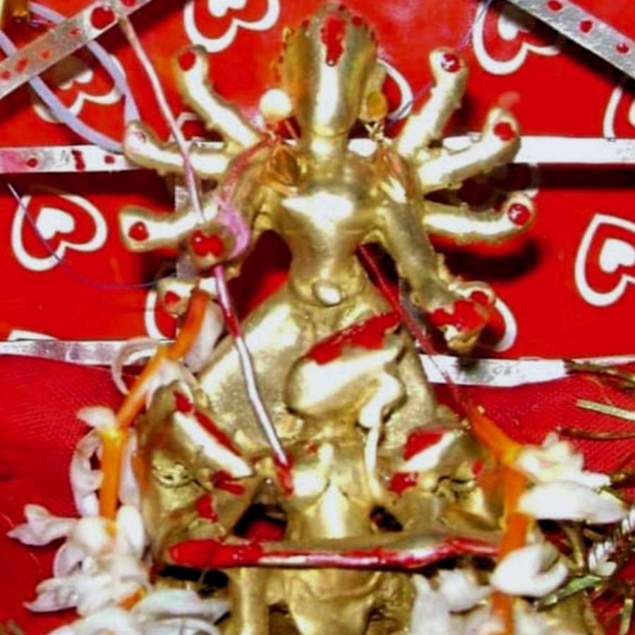 এই সোনার মূর্তির কিছু বিশেষত্ব আছে। দেবী দশভুজা হলেও, দু’হাতে ত্রিশূল ছাড়া বাকি হাতগুলি তাঁর নিরাস্ত্রই থাকে। লক্ষ্মী, সরস্বতী, গণেশ, কার্তিক— কেউই থাকেন না এই পুজোয়। আর দেবীর বাহন, আগেই বলা হয়েছে, সিংহ নয়, বাঘ। রায় বংশের উত্তরসূরিদের মতে, স্বাধীনতার দু'বছর পরে মহানবমীর দিনে রাজেন রায় দেবীর প্রাণপ্রতিষ্ঠা করে পুজো শুরু করেন। তিনি দেবী গোসানির মন্দিরের সেবায়েত ছিলেন এবং সোনার মূর্তি রাখার জন্য মন্দিরে গোপন গর্ভগৃহও তৈরি করেছিলেন।