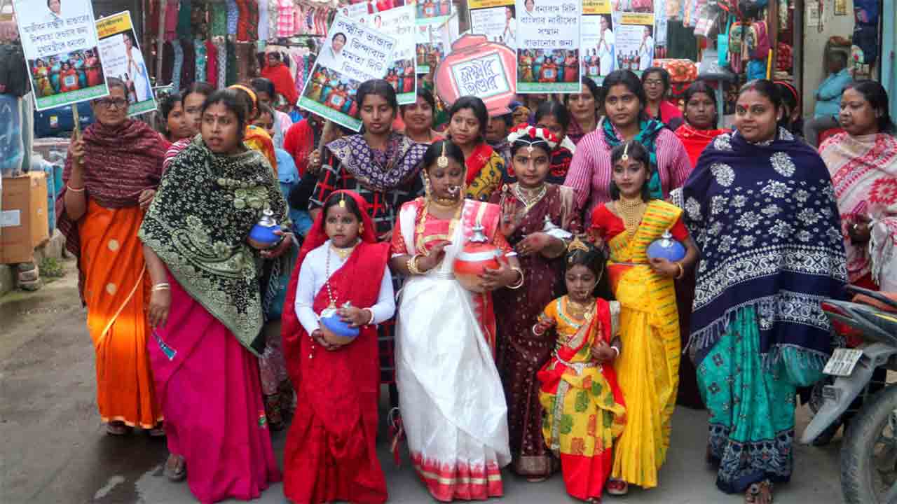 ভরসা: লক্ষ্মীর ভান্ডারের টাকা বাড়ায় প্রকল্পের প্রাপকদের আনন্দ-মিছিল। ৬ ফেব্রুয়ারি ২০২৬, বালুরঘাট। ছবি: অমিত মোহান্ত।