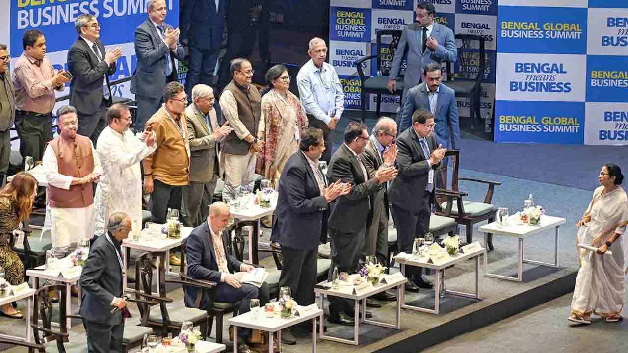 সার্থক?: বিশ্ব বঙ্গ বাণিজ্য সম্মেলনের সমাপ্তি অনুষ্ঠানে মুখ্যমন্ত্রী মমতা বন্দ্যোপাধ্যায় ও অন্যরা। ফেব্রুয়ারি, ২০২৫। ছবি: দেবস্মিতা ভট্টাচার্য।