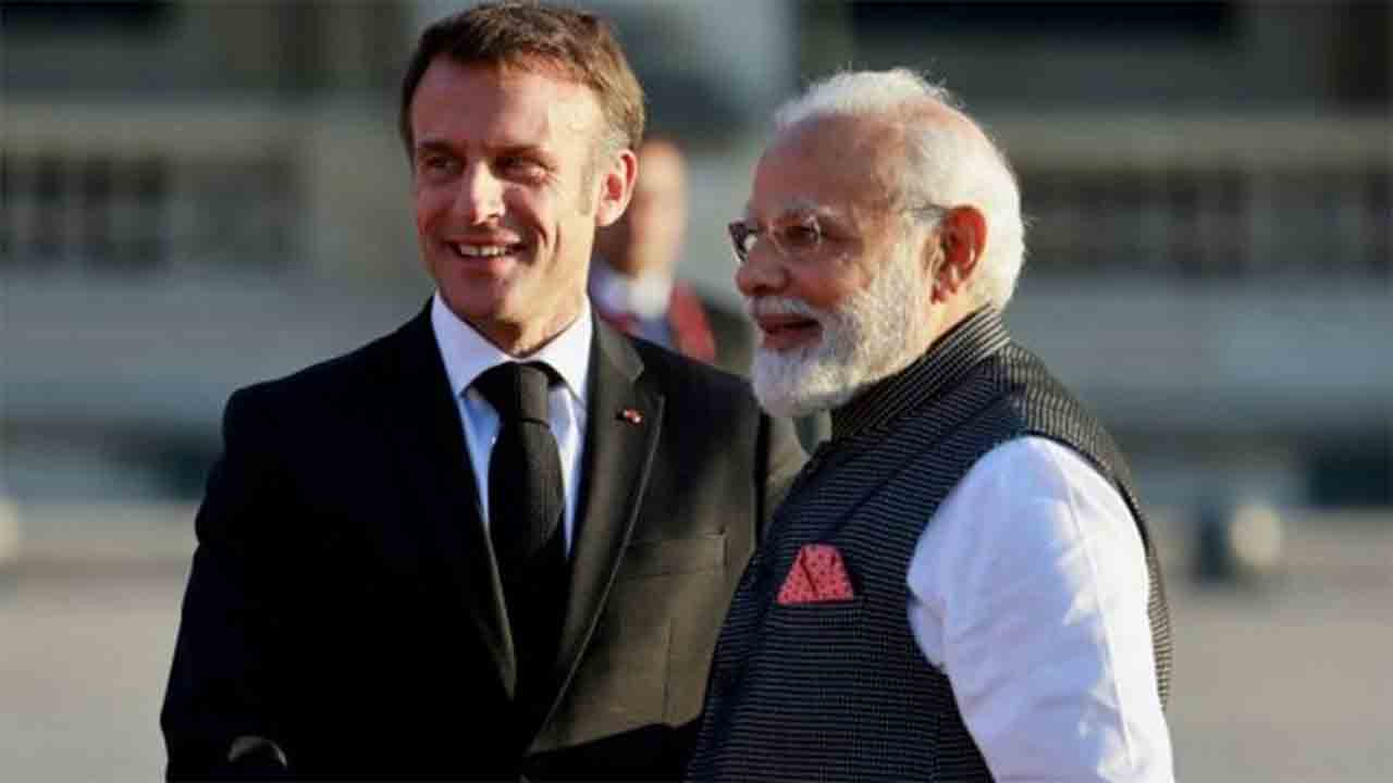 ফরাসি প্রেসিডেন্ট ইম্যানুয়েল মাকরঁ এবং ভারতের প্রধানমন্ত্রী নরেন্দ্র মোদী। ছবি: রয়টার্স।