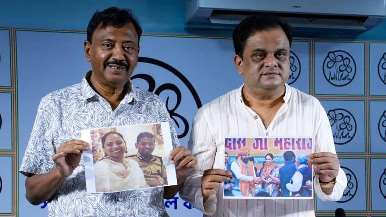 মঙ্গলবার তৃণমূল ভবনে এক সাংবাদিক বৈঠকে পুলিশ পর্যবেক্ষক জয়ন্ত কান্ত এবং তাঁর স্ত্রীর ছবি প্রকাশ করেন পার্থ ভৌমিক (বাঁ দিকে) এবং ব্রাত্য বসু (ডান দিকে)। ছবি: সংগৃহীত।