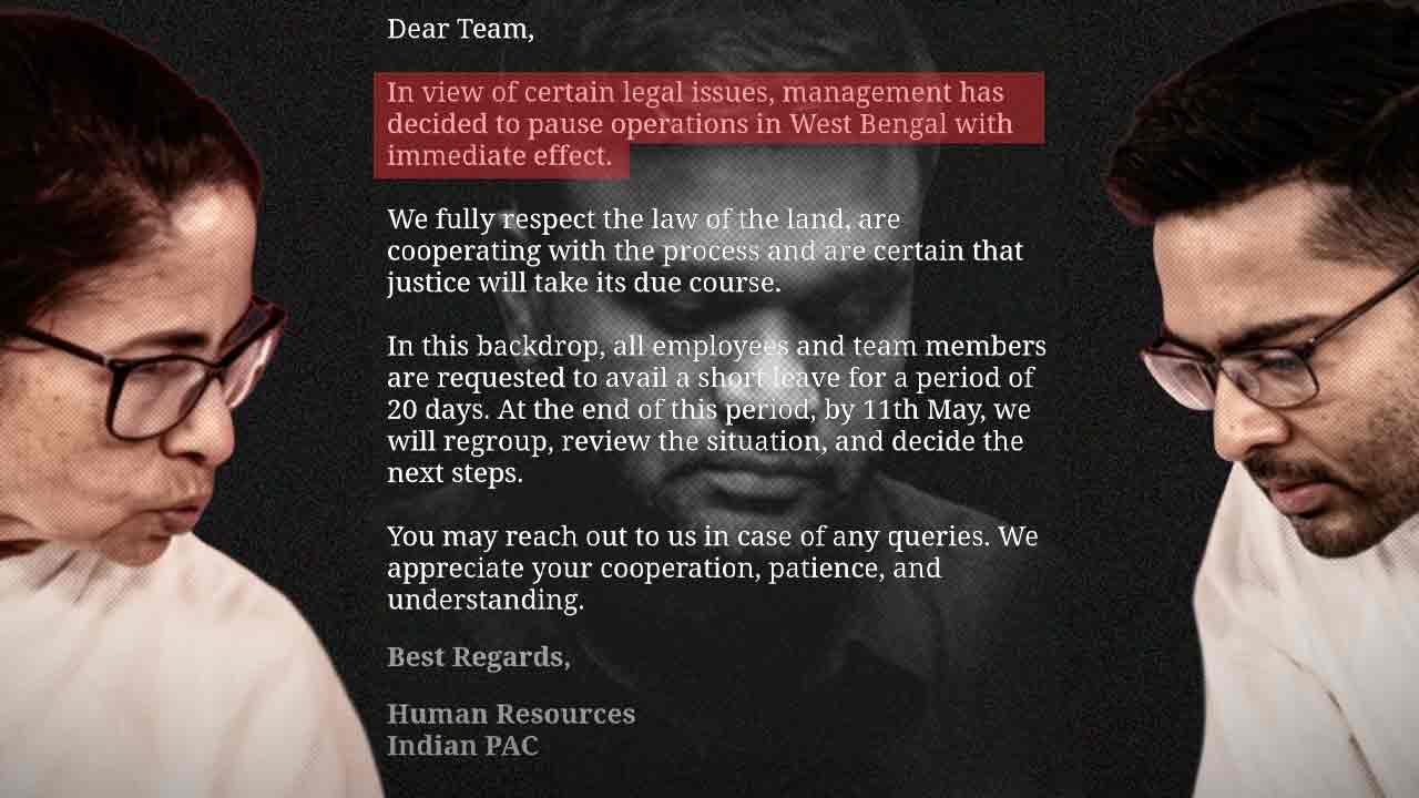শনিবার গভীর রাতে মেল করে পশ্চিমবঙ্গে প্রচারের কাজে কর্মরত কর্মীদের ২০ দিনের ছুটিতে যাওয়ার কথা জানায় আই-প্যাক। সেই ইমেলের প্রতিলিপি আনন্দবাজার ডট কম-এর হেফাজতে রয়েছে। সেই ইমেলটি ‘সিসি’ করা হয়েছে দু’জনকে। এক জন প্রতীক জৈন, অন্য জন অর্জুন দত্ত। ইমেলে উল্লেখ করা হয়েছে যে, আইনি বাধ্যবাধকতার কারণেই ‘অপারেশন’ বন্ধ রাখা হচ্ছে। লেখা হয়েছে, ‘আইনকে আমরা শ্রদ্ধা করি এবং গোটা প্রক্রিয়ায় সহযোগিতা করছি। নির্দিষ্ট সময়ে বিচার মিলবে, আমরা নিশ্চিত।’