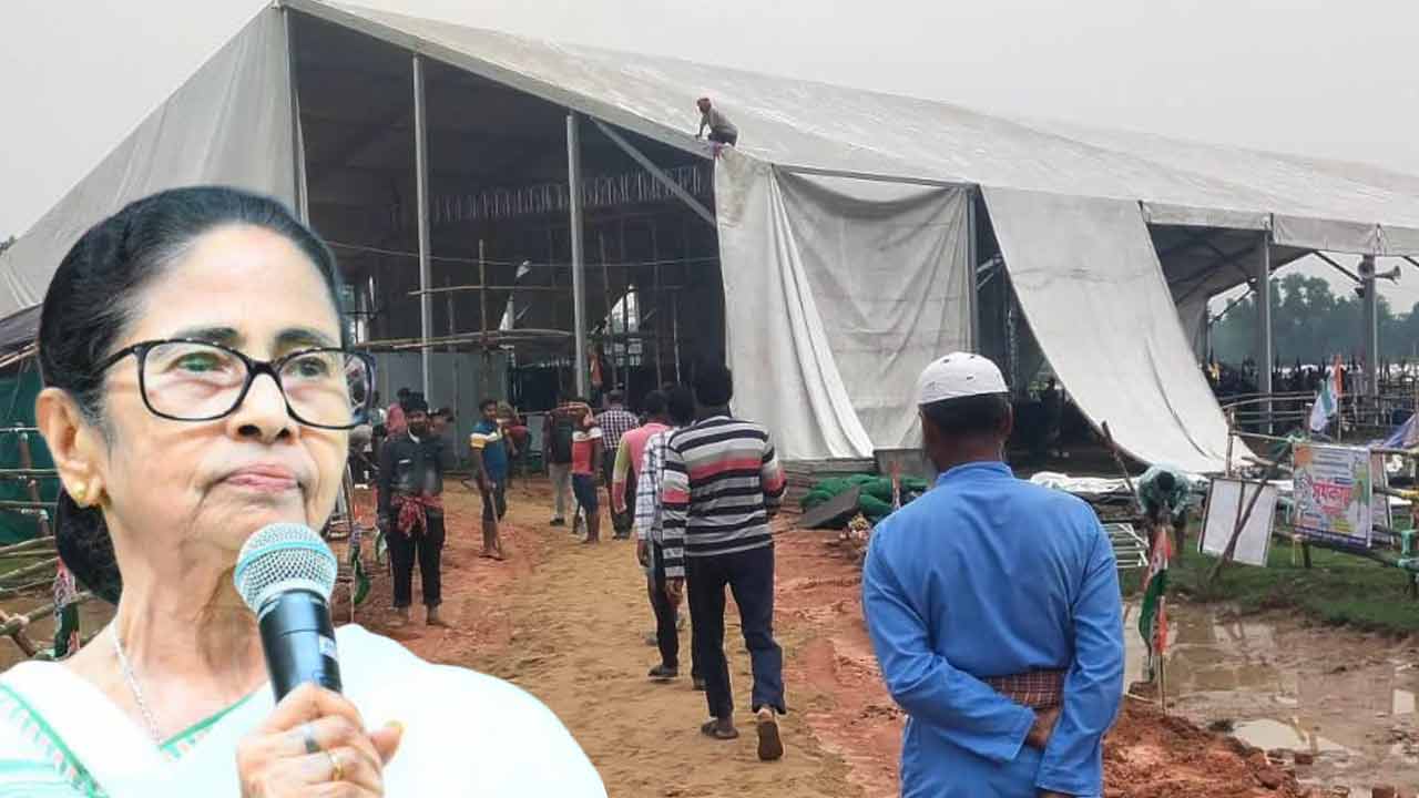 সোমবার রাতের ঝড়বৃষ্টির সভাস্থলের ছাউনি আংশিক ক্ষতিগ্রস্ত হয়। জলকাদা জমে যায় সভাস্থলের আশপাশে। ছাউনির একাংশ খুলে যায় ঝড়বৃষ্টির দাপটে। তবে মঙ্গলবার সকাল থেকেই সভাস্থলকে পুরনো চেহারায় ফেরাতে যুদ্ধকালীন তৎপরতায় কাজ চালাচ্ছেন ডেকরেটার্সের কর্মীরা। সভাস্থলকে ফের গুছিয়ে তুলতে সবরকম চেষ্টা চালিয়ে যাচ্ছেন দলীয় কর্মীসমর্থকেরা। মাঠের যে অংশে জলকাদা হয়ে গিয়েছে, সেখানে বালি ফেলা শুরু হয়েছে।