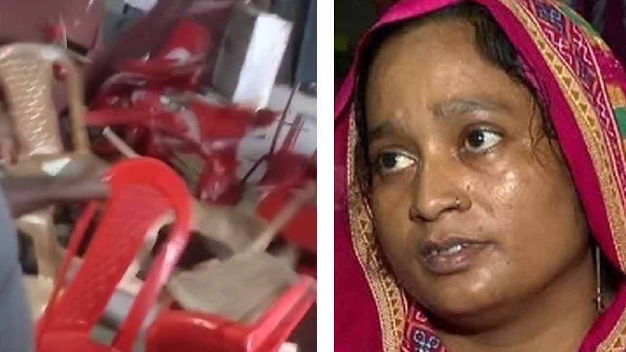 (বাঁ দিকে) সিপিএমের কার্যালয়ে বিশৃঙ্খলা। (ডান দিকে) তমন্নার মা সাবিনা ইয়াসমিন। —নিজস্ব ছবি।