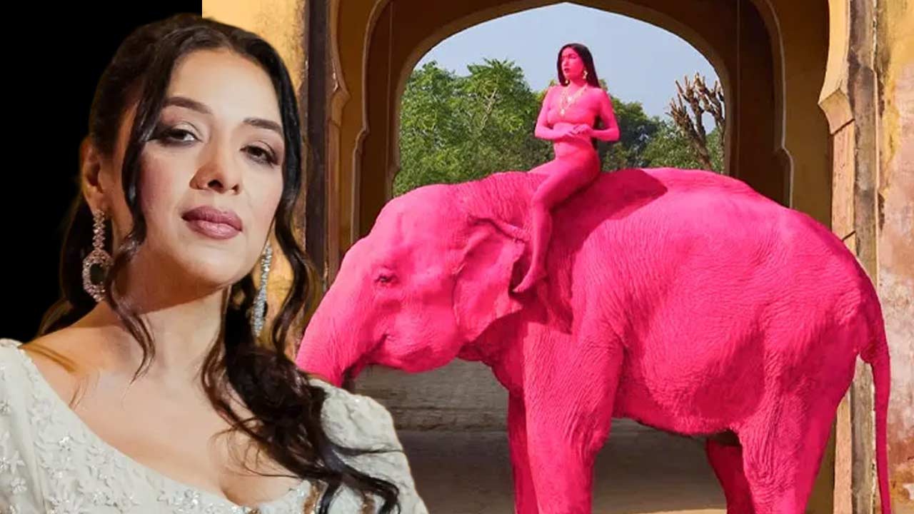 জয়পুরে একটি হাতির সারা গায়ে গোলাপি রং করা হয়। তার পরে তার পিঠে চেপে ফোটোশুট করেন এক মডেল।