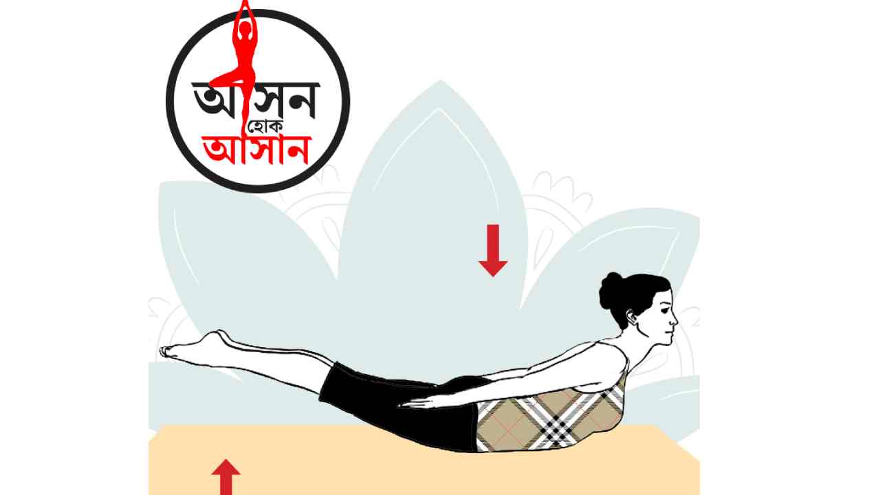 ১) উপুড় হয়ে ম্যাটের উপর শুয়ে পা দু’টি একসঙ্গে টান টান করে রাখুন। দুই হাত রাখুন দুই ঊরুর নীচে।