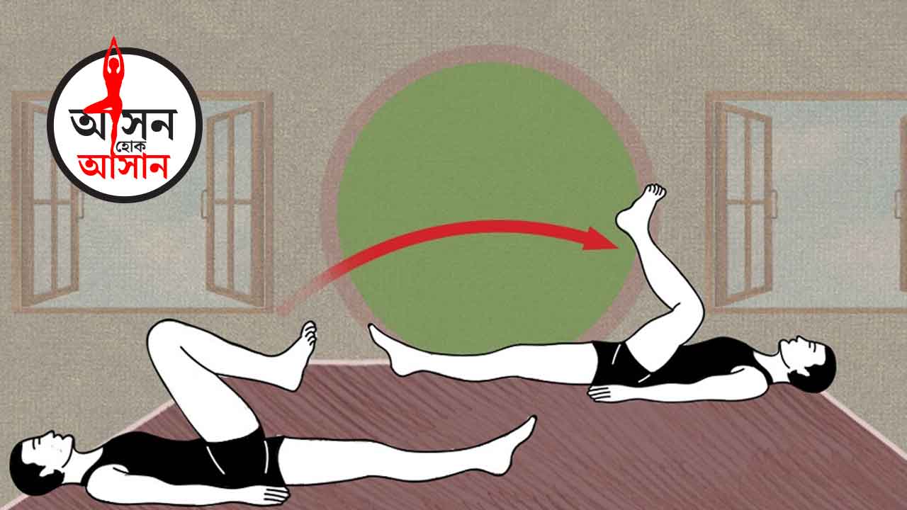 ২) বাঁ পা মাটিতে টানটান রেখে, ডান পায়ের হাঁটুর ভাঁজ করে বুকের কাছে নিয়ে আসতে হবে।
