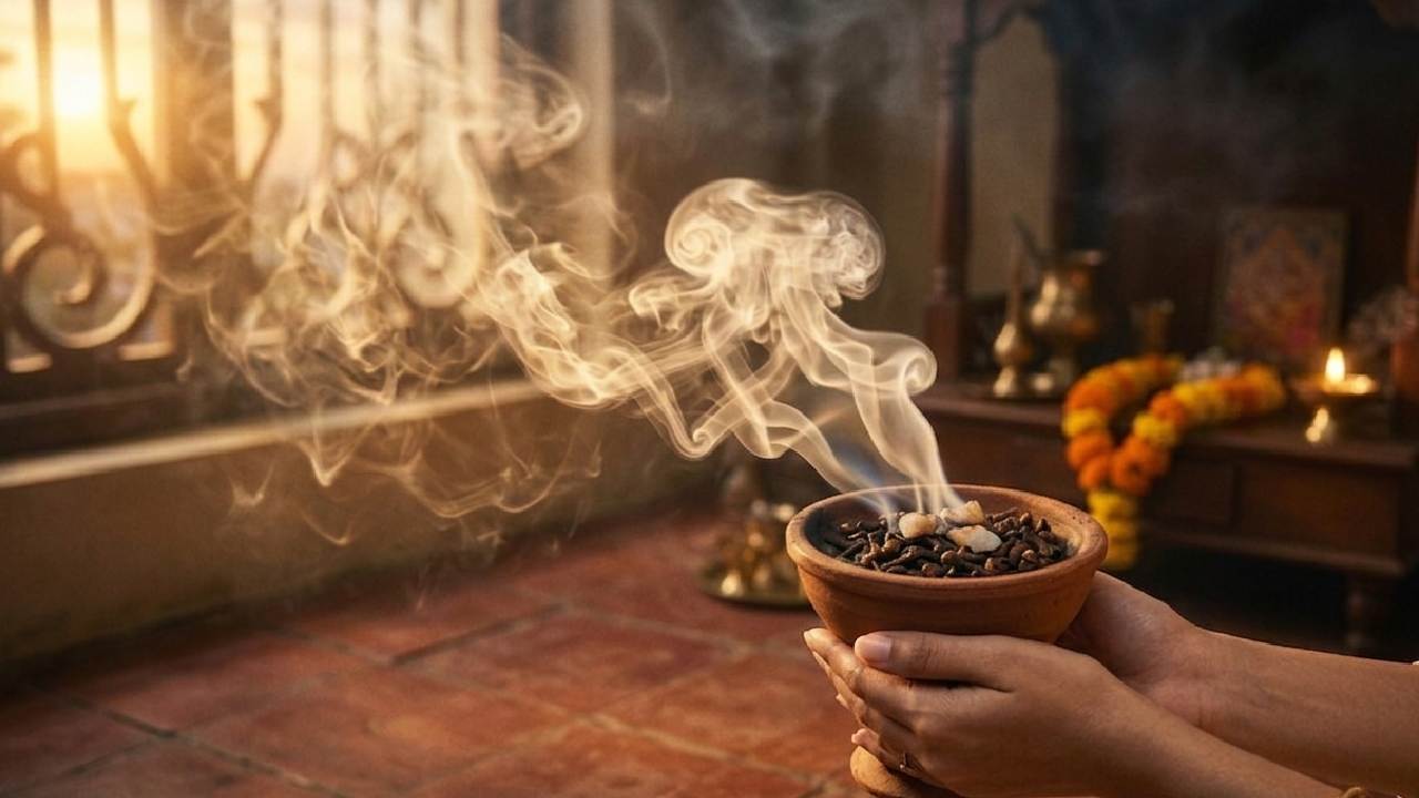প্রতি দিন সন্ধ্যায় একটি মাটির পাত্র বা ধুনুচিতে প্রথমে কর্পূর নিন। তাতে ফুল-সহ ৫-৭টি লবঙ্গ রাখুন। লবঙ্গগুলি ধীরে ধীরে পুড়বে এবং ধোঁয়া হবে। সেই ধোঁয়া গোটা বাড়িতে ছড়িয়ে দিন। এটি ঘরের কোণে জমে থাকা নেতিবাচক শক্তির বা নজরদোষের প্রভাব দূর করতে সাহায্য করে।