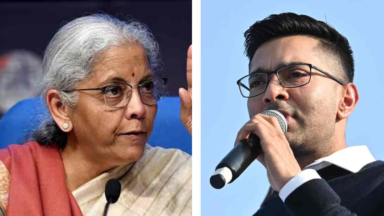 (বাঁ দিকে) কেন্দ্রীয় অর্থমন্ত্রী নির্মলা সীতারমণ। ডায়মন্ড হারবারের তৃণমূল সাংসদ অভিষেক বন্দ্যোপাধ্যায় (ডান দিকে)। —ফাইল চিত্র।