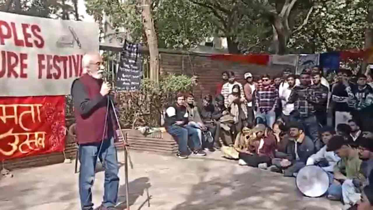 বৃহস্পতিবার দিল্লি বিশ্ববিদ্যালয়ের কলা বিভাগের ভবনের সামনে বক্তৃতা করছেন ইতিহাসবিদ ইরফান হাবিব। ছবি: সংগৃহীত।