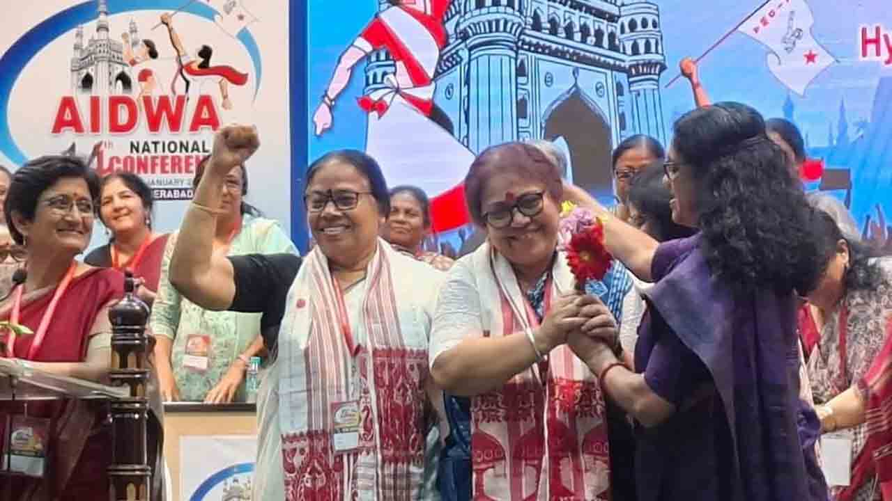 গণতান্ত্রিক মহিলা সমিতির সর্বভারতীয় সভাপতি ও সাধারণ সম্পাদক নির্বাচিত হওয়ার পরে পি শ্রীমতি ও কনীনিকা ঘোষ (ডান দিকে)। হায়দরাবাদে। নিজস্ব চিত্র।