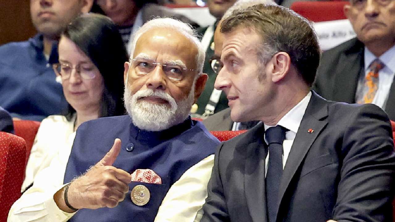 দিল্লির এআই সম্মেলনে ভারতের প্রধানমন্ত্রী নরেন্দ্র মোদীর সঙ্গে ফ্রান্সের প্রেসিডেন্ট ইমানুয়েল মাক্রোঁ (ডান দিকে)। ছবি: পিটিআই।