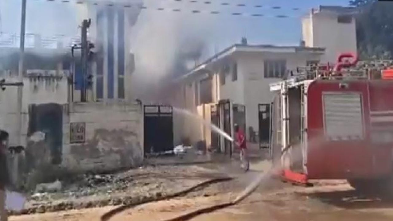 রাজস্থানের রাসায়নিক কারখানায় আগুন নেবানোর চেষ্টায় দমকল। সোমবার। ছবি: ভিডিয়ো থেকে।