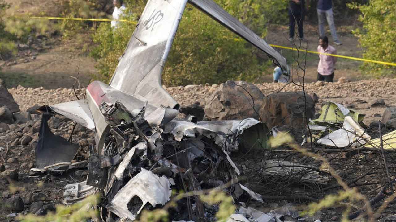 বারামতীতে ভেঙে পড়া সেই বিমান। ছবি: পিটিআই।