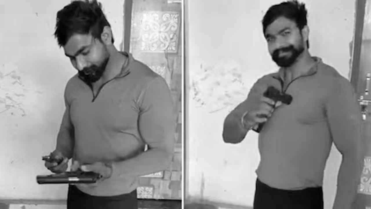 লাল ফুলহাতা টি-শার্ট। কালো ট্রাউজ়ার। হাতে ধরা গুলিভর্তি পিস্তল। ডান হাতে ধরা সেই পিস্তল বুকের বাঁ দিকে তাক করে রেখেছেন। ওই অবস্থাতেই ক্যামেরার দিকে তাকিয়ে মুচকি হাসি দিয়ে রিল বানাচ্ছিলেন পূর্ব দিল্লির এক যুবক। ভিডিয়ো করছিলেন তাঁরই এক বন্ধু।
