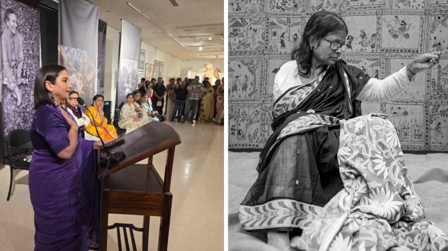 আলোকচিত্র প্রদর্শনীতে বক্তব্য পেশ করছেন অভিনেত্রী দিব্যা দত্ত (বাঁ দিকে)। কৌন্তেয় সিংহের তোলা ছবি ( ডান দিকে)। নিজস্ব চিত্র।
