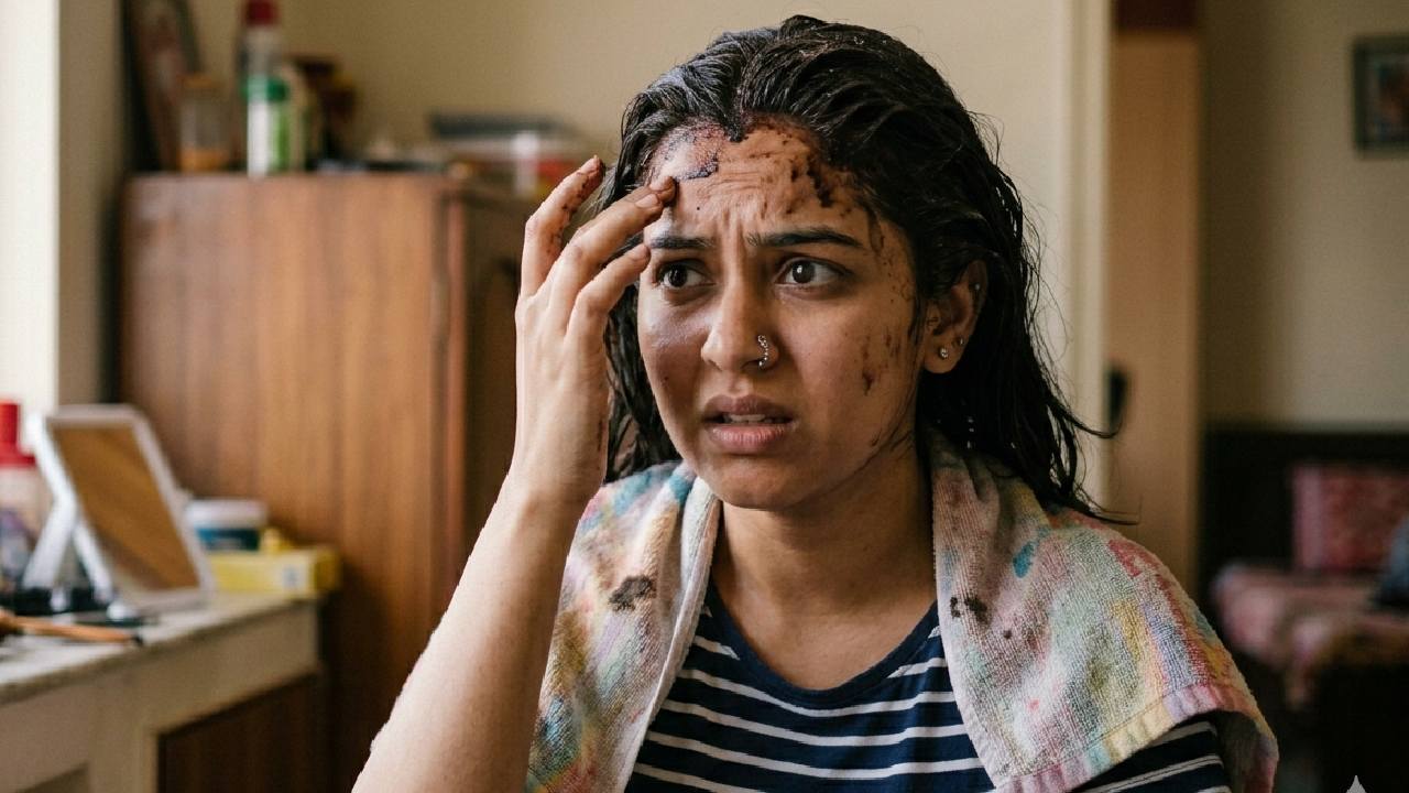 চুলে রং করতে গিয়ে মুখেও লেগেছে, কী ভাবে তা উঠবে? ছবি: এআই সহায়তায় প্রণীত।