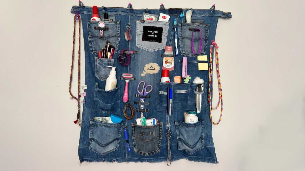 শক্ত বোর্ডে একরঙা তবে হালকা রঙের কাপড় আঠার সাহায্যে আটকে দিন। একাধিক জিনস থেকে রকমারি পকেট সংগ্রহ করুন। কোলাজের মতো করে কাডবোর্ডের উপরে আঠার সাহায্যে পকেটগুলি আটকে দিন। পকেটের চার ধারে আঠা দিতে হবে, মাঝে নয়। এতে পকেটটি ব্যবহারোপযোগী থাকবে। শুধু পকেট নয়, জিন্সের বেল্ট লাগানোর ঘরগুলি কেটেও কায়দা করে লাগাতে পারেন। বোর্ডের ধার বরাবর সুন্দর লেস লাগিয়ে দিন। জিন্সের ব্যাগ থাকলে তার ফিতে কেটে আঠার সাহায্যে কাডবোর্ডের উপর দিকে, সেটি ঝোলানো যায়, এমন ভাবে লাগিয়ে দিন। পকেটের ভিতরে প্রয়োজনীয় জিনিসপত্র গুছিয়ে রাখুন।