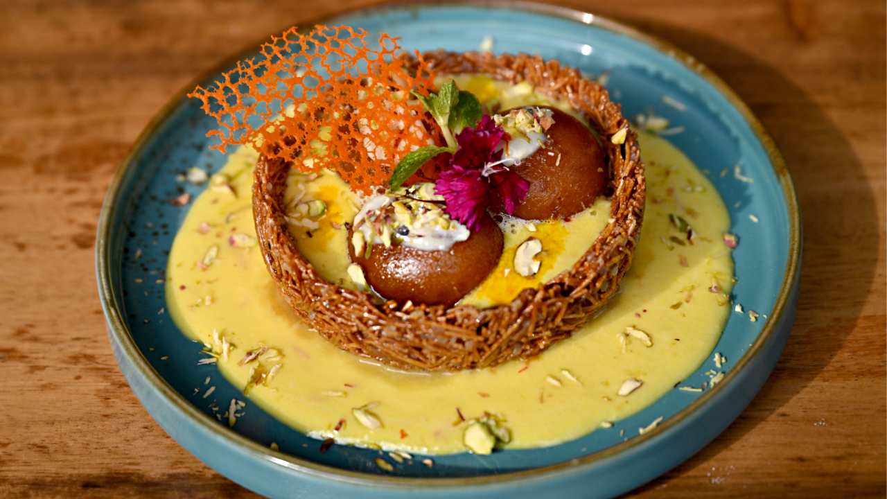 ক্যারাম্যালাইজ় সোমাইয়ের বাটিতে রাবড়িতে ডোবা বাহারি গুলাব জামুন। ছবি: সংগৃহীত।