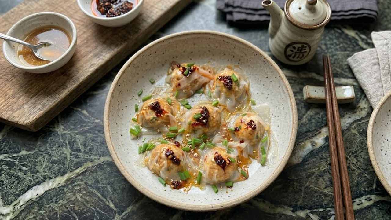 মুরগির কিমা মিক্সিতে ঘুরিয়ে ভাল করে পেস্ট বানিয়ে নিন। একটি বড় পাত্রে মুরগির কিমা, আদাকুচি, রসুনকুচি, কুচোনো পেঁয়াজশাক, নুন, গোলমরিচগুঁড়ো, সয়া সস্ আর আজিনোমোটো মিশিয়ে নিন। এ বার একটি ফ্রায়িং প্যানে সামান্য তেল গরম করে নিন। বানিয়ে রাখা কিমার মিশ্রণ থেকে ছোট ছোট বল বানিয়ে ফ্রায়িং প্যানের উপর ছড়িয়ে রাখুন। প্যানটি পাঁচ মিনিট ঢেকে রাখুন। এ বার গোল রাইস শিটগুলি মাঝ বরাবর কেটে দু’টুকরো করে নিন। পেপারগুলি অল্প জলে ভিজিয়ে বলগুলি ঢেকে দিন ঠিক চাদরের মতো করে। এ বার বাটিতে সয়া সস্, চিলি অয়েল, সুইট চিলি সস্, রসুনকুচি, পেঁয়াজশাক কুচোনো ভাল করে মিশিয়ে একটি সস্ বানিয়ে নিন। ডাম্পলিংগুলির উপর ছড়িয়ে দিন সেই সস্। প্যানটি ঢাকা দিয়ে আরও মিনিট পাঁচেক রান্ন করুন। গরম গরম পরিবেশন করুন চিকেন ডাম্পলিং।