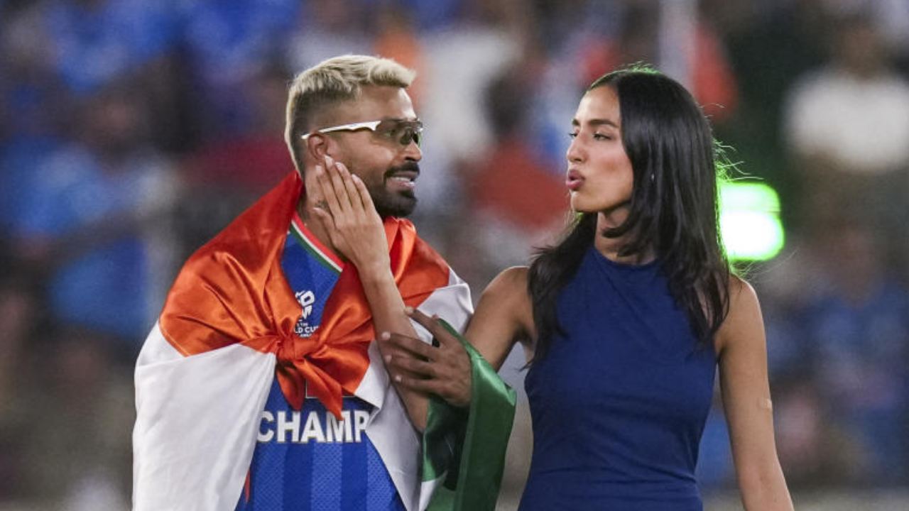 ফাইনালের পর বান্ধবী মাহিকাকে (ডান দিকে) নিয়ে উচ্ছ্বাসের মুহূর্তে হার্দিক। ছবি: পিটিআই।