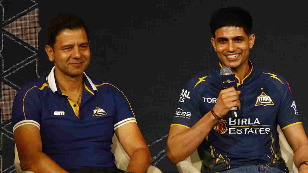 গুজরাত টাইটান্সের অধিনায়ক শুভমন গিলের (ডান দিকে) সঙ্গে বিক্রম সোলাঙ্কি। ছবি: পিটিআই।