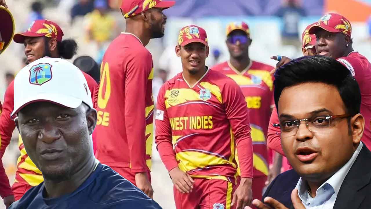 (বাঁ দিকে) ড্যারেন স্যামি এবং জয় শাহ (ডান দিকে)। পিছনে, ওয়েস্ট ইন্ডিজ় দল। গ্রাফিক: আনন্দবাজার ডট কম।