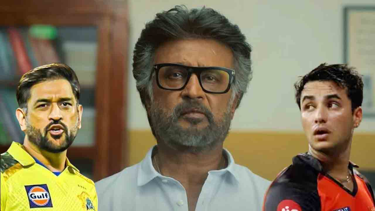 (বাঁ দিক থেকে) মহেন্দ্র সিংহ ধোনি, রজনীকান্ত এবং অভিষেক শর্মা। — ফাইল চিত্র।