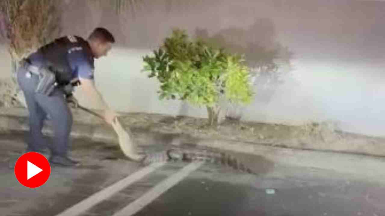‘ফার্স্টপোস্ট’ নামের অ্যাকাউন্ট থেকে ইনস্টাগ্রামের পাতায় একটি ভিডিয়ো পোস্ট করা হয়েছে। সেই ভিডিয়োয় দেখা গিয়েছে যে, পার্কিং লটে একটি অ্যালিগেটরের সঙ্গে ‘লড়াই’ চালিয়ে যাচ্ছেন দুই তরুণ। হাঁ করে পুলিশদের দিকে অ্যালিগেটরটি এগিয়ে গেলেও পুলিশেরা ভয় পেলেন না। বরং দু’জনে অ্যালিগেটরের মুখ চেপে ধরে বেঁধে দিলেন। মুখ বাঁধা পড়তেই গোল গোল করে ঘুরতে শুরু করল অ্যালিগেটরটি।।