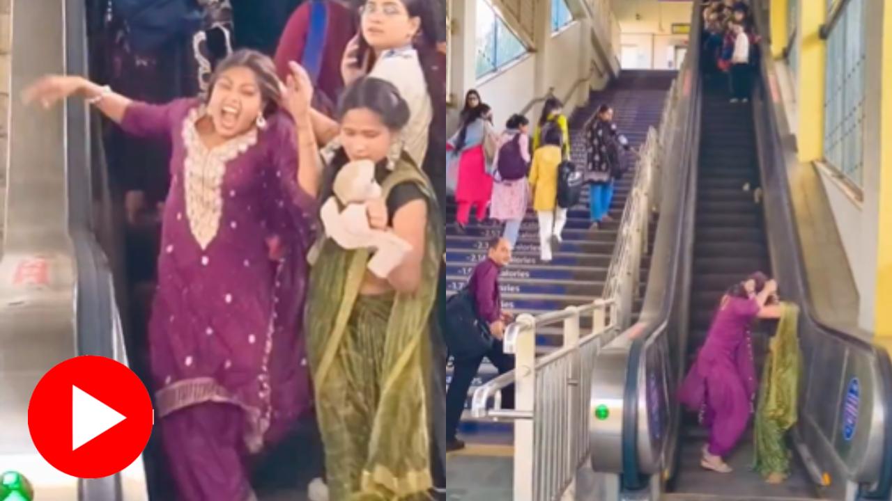 স্বয়ংক্রিয় সিঁড়িতে দুই তরুণীর ঝামেলা। ছবি: এক্স থেকে নেওয়া।