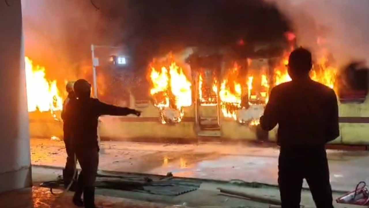 রবিবার ভোরে কাটোয়া স্টেশনে আজিমগঞ্জ প্যাসেঞ্জারে অগ্নিকাণ্ডের দৃশ্য। — ফাইল চিত্র।
