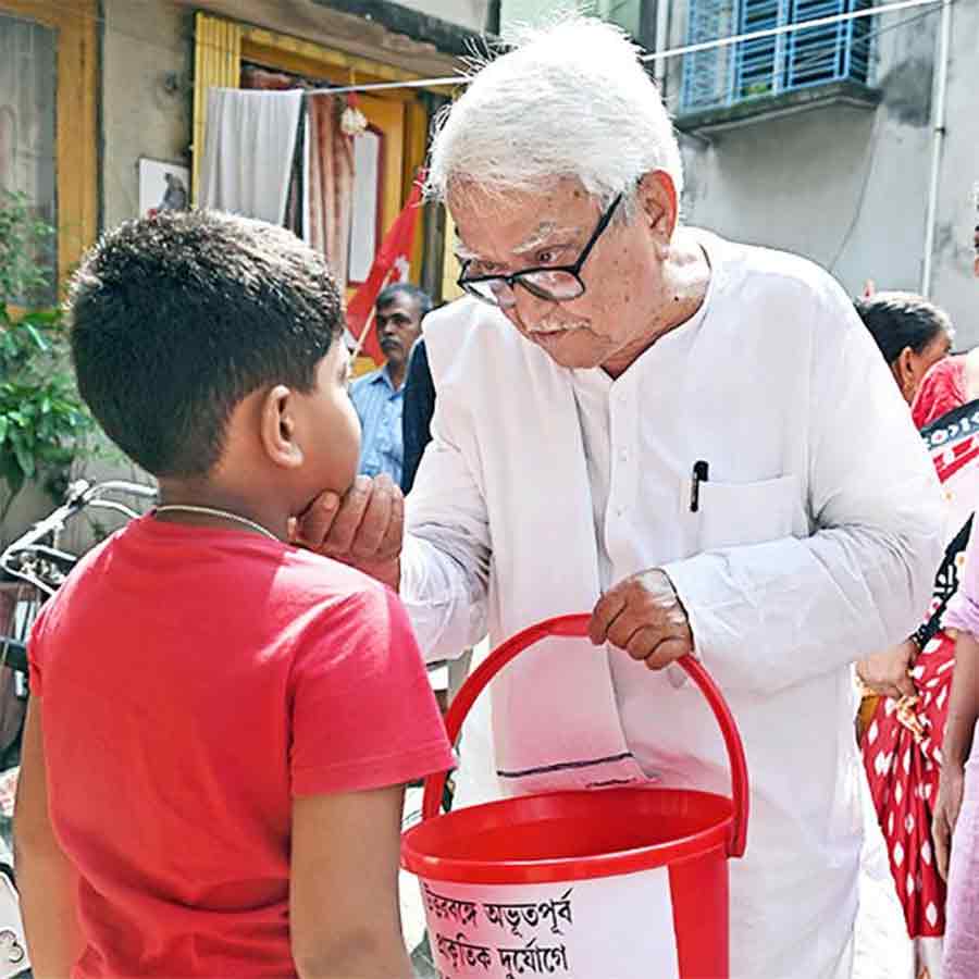 উত্তরবঙ্গের বন্যা দুর্গতদের জন্য ত্রাণ সংগ্রহে বিমান বসু। দমদমের বীরপাড়া এলাকায়। —নিজস্ব চিত্র।