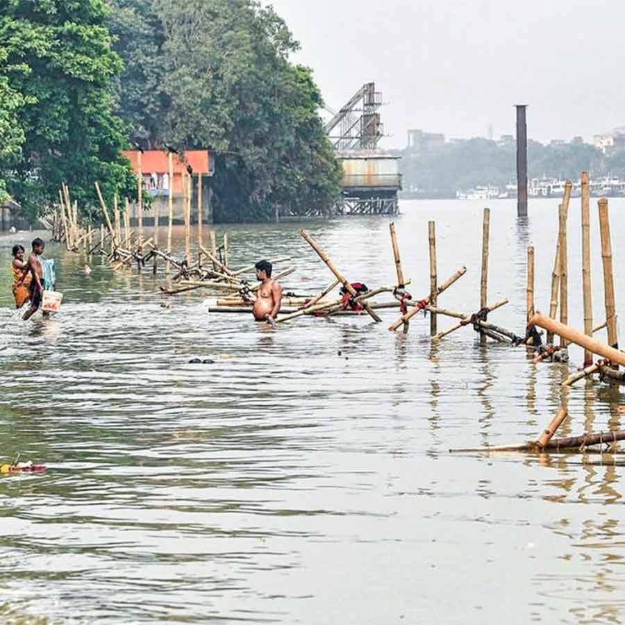 ছটপুজোর জন্য আগাম সতর্কতায় গঙ্গায় দেওয়া হয়েছে বাঁশের ব্যারিকেড। ছবি: দীপঙ্কর মজুমদার।
