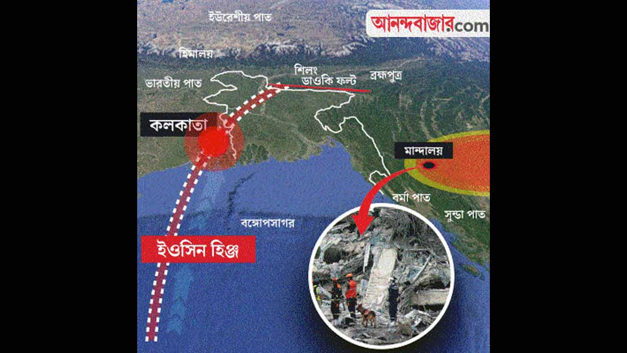 মায়ানমার এবং তাইল্যান্ডে সদ্য যে ভূমিকম্প হয়েছে, তার উৎসস্থল ছিল মায়ানমারের মান্দালয় শহরের নীচে। ভূতত্ত্ববিদরা বলছেন, মান্দালয়ের নীচে ভূস্তরে ‘সাগাইং ফল্ট’ নামে যে সুদীর্ঘ ফাটল বা ‘চ্যুতিরেখা’ রয়েছে, সেখান থেকেই এই কম্পন উঠে এসেছে। ভূস্তরের এই সব ফাটল বা দুর্বল অংশই সাধারণত ভূমিকম্পের জন্ম দেয়। সেই কারণেই কলকাতা শহর নিয়েও উদ্বেগের কারণ রয়েছে বলে মনে করছেন ভূতত্ত্ববিদেরা। কারণ, কলকাতার অবস্থানও এই রকমই এক ভূতাত্ত্বিক রেখার ঠিক উপরেই। সে রেখা কোনও ফাটল নয়, কিন্তু মহাদেশীয় পাতের ভাঙনের রেখা। যার গভীরে ফাটল থাকতে পারে বলে ভূতাত্ত্বিকদের অনুমান। ফাটল না থাকলেও ওই অঞ্চল থেকে ভূমিকম্পের আশঙ্কা আছে বলে ভূতাত্ত্বিক পর্যবেক্ষণে দেখা যাচ্ছে।