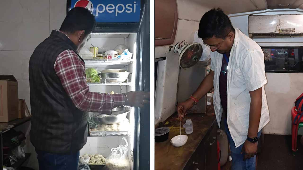 মুচিবাজারে খাবারের দোকানগুলিতে নমুনা পরীক্ষা খাদ্য সুরক্ষা আধিকারিকদের। —নিজস্ব চিত্র।