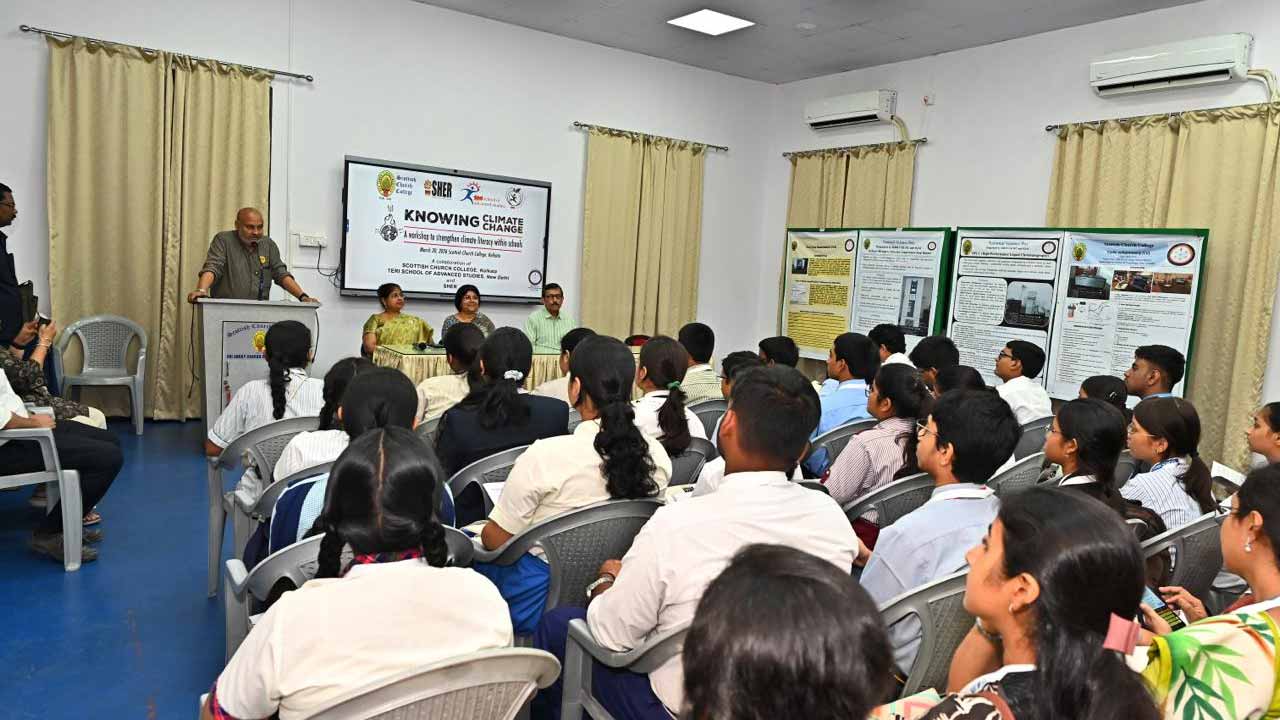 কর্মশালার উদ্বোধন পর্বে উপস্থিত ছিলেন স্কটিশ চার্চ কলেজের অধ্যক্ষা মধুমঞ্জরী মণ্ডল, টেরি এসএএস-এর অধ্যাপক রঞ্জনা রায়চৌধুরী। কর্মশালার প্রথম পর্বে অবসরপ্রাপ্ত বনকর্তা শ্রী দেবল রায় জলবায়ু পরিবর্তনের প্রাথমিক ধারণা তুলে ধরেন। তিনি গ্রিনহাউস গ্যাসের প্রভাব, সমুদ্রের কার্বন সিঙ্ক হিসাবে ভূমিকা, জলবায়ু পরিবর্তনের ঐতিহাসিক প্রেক্ষাপট, তার সামাজিক-অর্থনৈতিক প্রভাব এবং পরিবেশ রক্ষায় প্রশাসনিক নীতি প্রণয়নের জটিলতা সম্পর্কে আলোচনা করেন। অন্য দিকে, রঞ্জনা ‘ক্লাইমেট স্মার্ট সিটি’ বা জলবায়ু-সচেতন নগরায়ণ বিষয়ে আলোকপাত করেন। সেখানে তিনি তাপপ্রবাহ, সমুদ্রের জলস্তর বৃদ্ধি এবং খাদ্য ও পানীয় জলের সঙ্কটের সঙ্গে বিশ্ব উষ্ণায়নের সম্পর্ক তুলে ধরেন। পাশাপাশি, ‘আরবান হিট আইল্যান্ড’ (নগরায়নের ফলে উষ্ণতা বৃদ্ধির ঘটনা) প্রভাব ও আধুনিক নগরের জন্য কার্যকর অভিযোজন-কাঠামোর প্রয়োজনীয়তার কথাও তিনি ব্যাখ্যা করেন। দ্বিতীয় অধিবেশন-পর্বে সাংবাদিক শ্রী জয়ন্ত বসু আন্তর্জাতিক জলবায়ু কূটনীতি ও সিওপি-কাঠামো (রাষ্ট্রপুঞ্জের জলবায়ু পরিবর্তন সংক্রান্ত উদ্যোগ ‘কনফারেন্স অফ দ্য পার্টিস’)-র বিবর্তন সম্পর্কে শিক্ষার্থীদের ধারণা দেন। সুন্দরবনের ক্ষয়ক্ষতি, পুনর্বাসন এবং ‘জাস্ট ট্রানজিশন’-এর প্রাসঙ্গিক উদাহরণের মাধ্যমে তিনি আন্তর্জাতিক বিষয়গুলিকে স্থানীয় বাস্তবতার নিরিখে তুলে ধরেন।