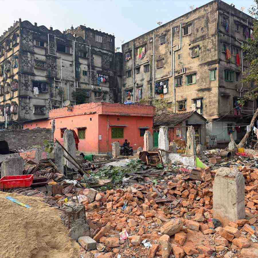 বেরঙিনই বটে। গার্ডেনরিচের এই রংহীন দুনিয়ার নাম আজহার মোল্লা গার্ডেন। যেখানে ২১ মাস আগের বিপর্যয়ের স্মৃতি এখনও টাটকা। ২০২৪ সালের ১৭ মার্চ নির্মীয়মাণ পাঁচতলা বাড়ি ভেঙে যেখানে ১৩ জনের মৃত্যু হয়েছিল। পুরসভার লোকজন এসে তার পরে ক্ষতিগ্রস্ত আরও কয়েকটি বাড়ি ভেঙে দিয়ে গিয়েছিলেন। সেই ধ্বংসস্তূপের এক দিকে নতুন নির্মাণ মাথা তুলতে শুরু করেছে বটে। তবে এখনও খাঁ খাঁ করছে মৃত্যুপুরী।