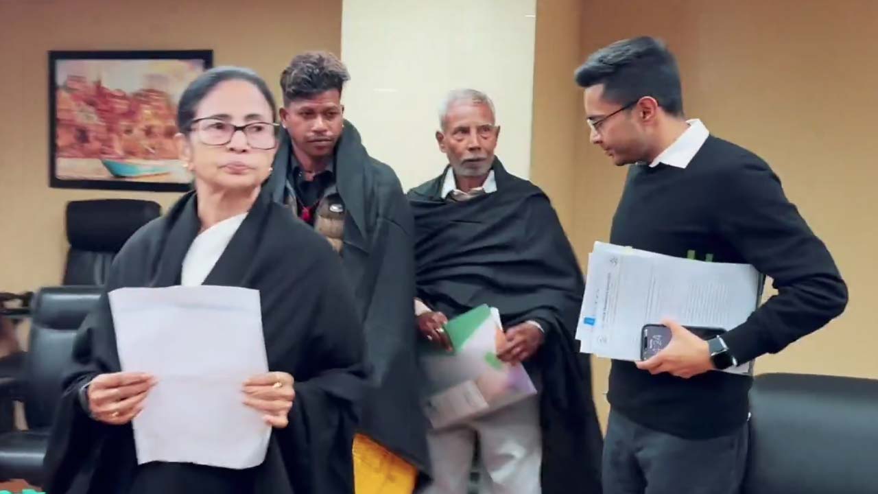 মমতার সঙ্গে রয়েছেন ‘এসআইআরের কারণে ক্ষতিগ্রস্ত’দের কয়েক জন। সকলের পরনেই কালো পোশাক। কারও পরনে কালো চাদর, কেউ আবার পরেছেন কালো সোয়েটার। সাধারণ ভাবে প্রতিবাদের প্রতীক হিসাবে কালো পোশাক ইত্যাদি ব্যবহার করা হয়।