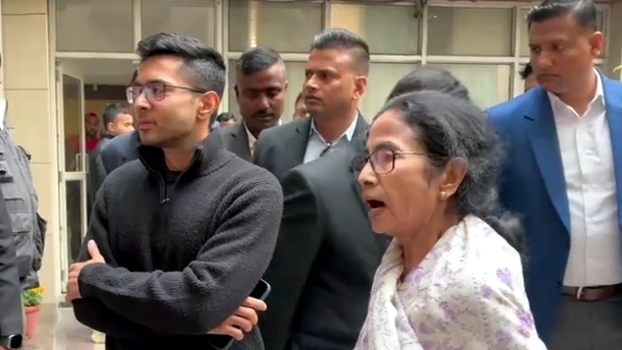 বঙ্গভবনে পশ্চিমবঙ্গের মুখ্যমন্ত্রী মমতা বন্দ্যোপাধ্যায় এবং তৃণমূলের সর্বভারতীয় সাধারণ সম্পাদক অভিষেক বন্দ্যোপাধ্যায়। সোমবার। ছবি: ভিডিয়ো থেকে।