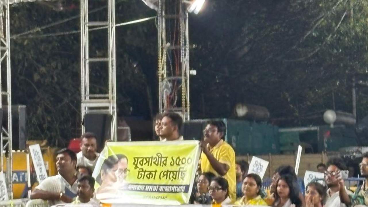 মমতার ঘোষণার কয়েক ঘণ্টা কাটার পর সন্ধ্যায় চন্দ্রিমা ধর্নামঞ্চ থেকে বলেন, ‘‘যুবসাথীর ১,৫০০ টাকা ঢুকে গিয়েছে। দিদি সকালে বলেছিলেন। বিকেলে ঢুকে গিয়েছে।’’ কিছু ক্ষণ পরে মমতা যখন বক্তৃতা করতে ওঠেন, তখন ধর্মতলার ভিড়ে কয়েক জনের হাতে প্ল্যাকার্ড দেখা যায়। তাতে লেখা, ‘যুবসাথীর ১,৫০০ টাকা পেয়েছি। ধন্যবাদ মমতা বন্দ্যোপাধ্যায়।’’ বক্তৃতার মাঝে তা নজরে পড়ে মুখ্যমন্ত্রীর। তিনি জানতে চান, ‘‘পেয়েছ? আজ থেকেই ছেড়েছি।’’