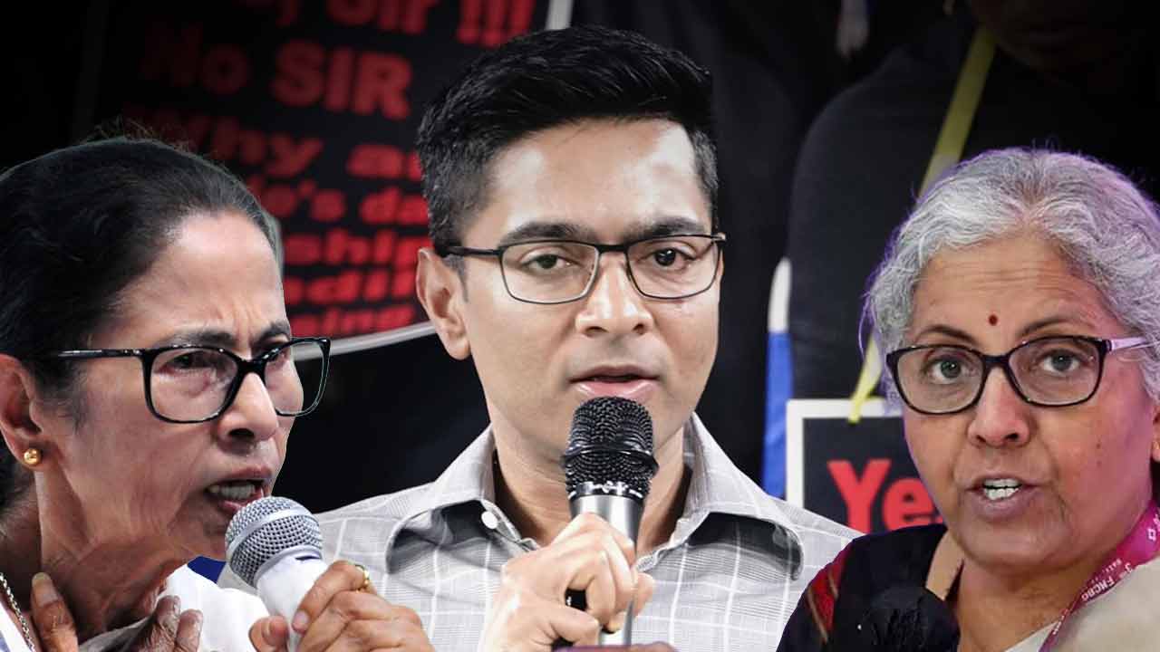(বাঁ দিক থেকে) পশ্চিমবঙ্গের মুখ্যমন্ত্রী মমতা বন্দ্যোপাধ্যায়, তৃণমূল সাংসদ অভিষেক বন্দ্যোপাধ্যায় এবং কেন্দ্রীয় অর্থমন্ত্রী নির্মলা সীতারমণ। গ্রাফিক: আনন্দবাজার ডট কম।