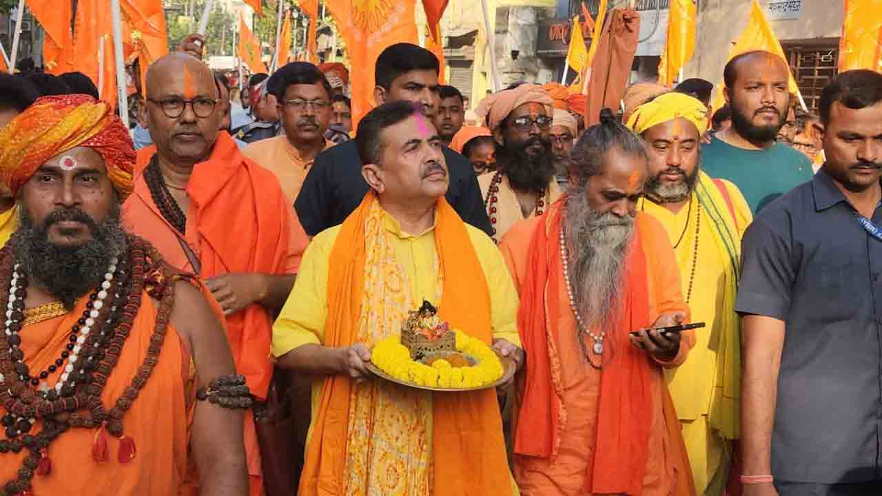 ভবানীপুরে আবার বিরোধী দলনেতা শুভেন্দু অধিকারী। মঙ্গলবার সকালে মুখ্যমন্ত্রী মমতা বন্দ্যোপাধ্যায়ের বিধানসভা কেন্দ্রে যান শুভেন্দু। সেখানে দোল উৎসব পালন করেন। প্রচুর বিজেপি কর্মী-সমর্থক হাজির হয়েছিলেন সেখানে। তিনি বলেন, ‘‘নাস্তিকতা নিপাত যাক। সেকুলারিজ়ম নিপাত যাক। হিন্দুরা যাতে পশ্চিমবঙ্গে সুরক্ষিত থাকে এই প্রার্থনা করব।’’ তিনি দোলের শুভেচ্ছা জানান সকলকে। তার পর গান ধরেন, ‘গোরা গোরা গৌরাঙ্গ। তিনি আওয়াজ তোলেন, ‘‘হিন্দু-হিন্দু ভাই-ভাই।’’