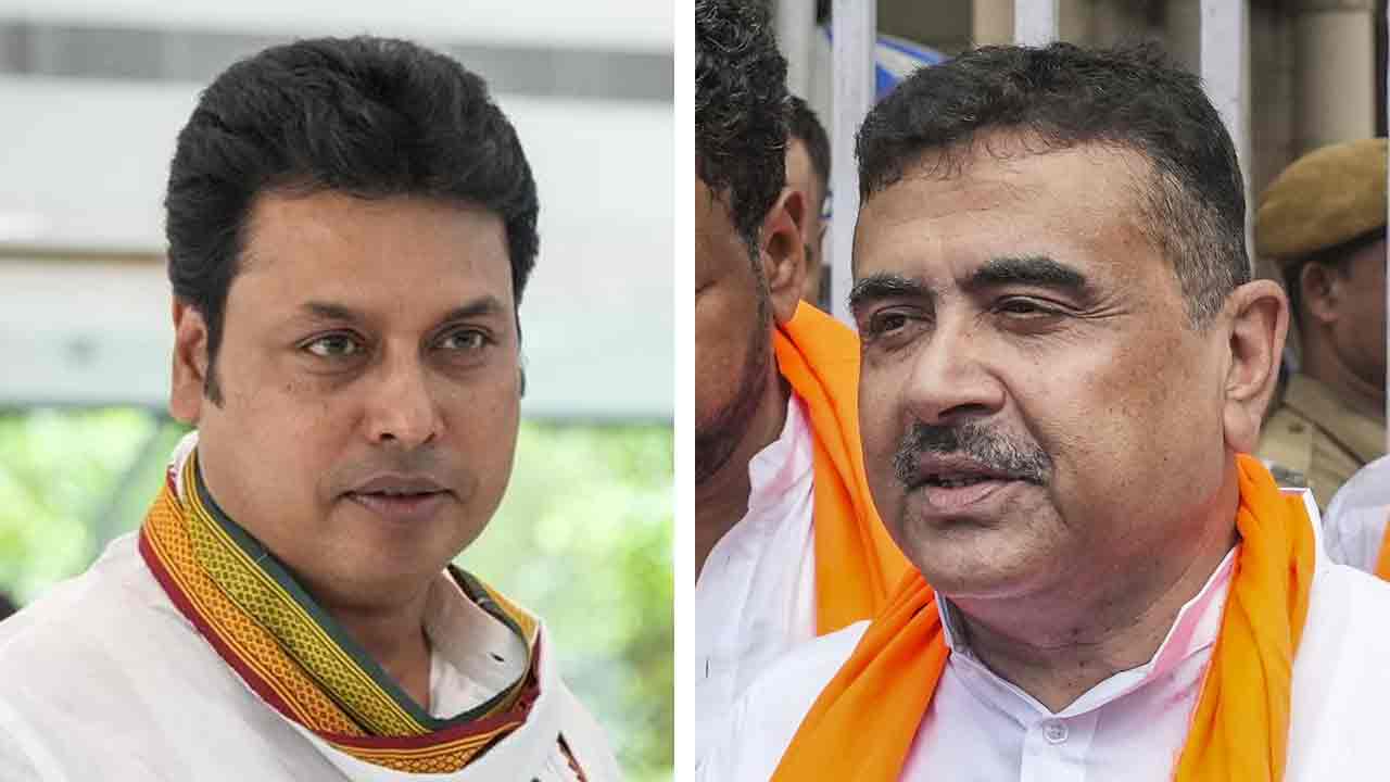 (বাঁ দিকে) বিপ্লব দেব, শুভেন্দু অধিকারী (ডান দিকে)। —ফাইল চিত্র।