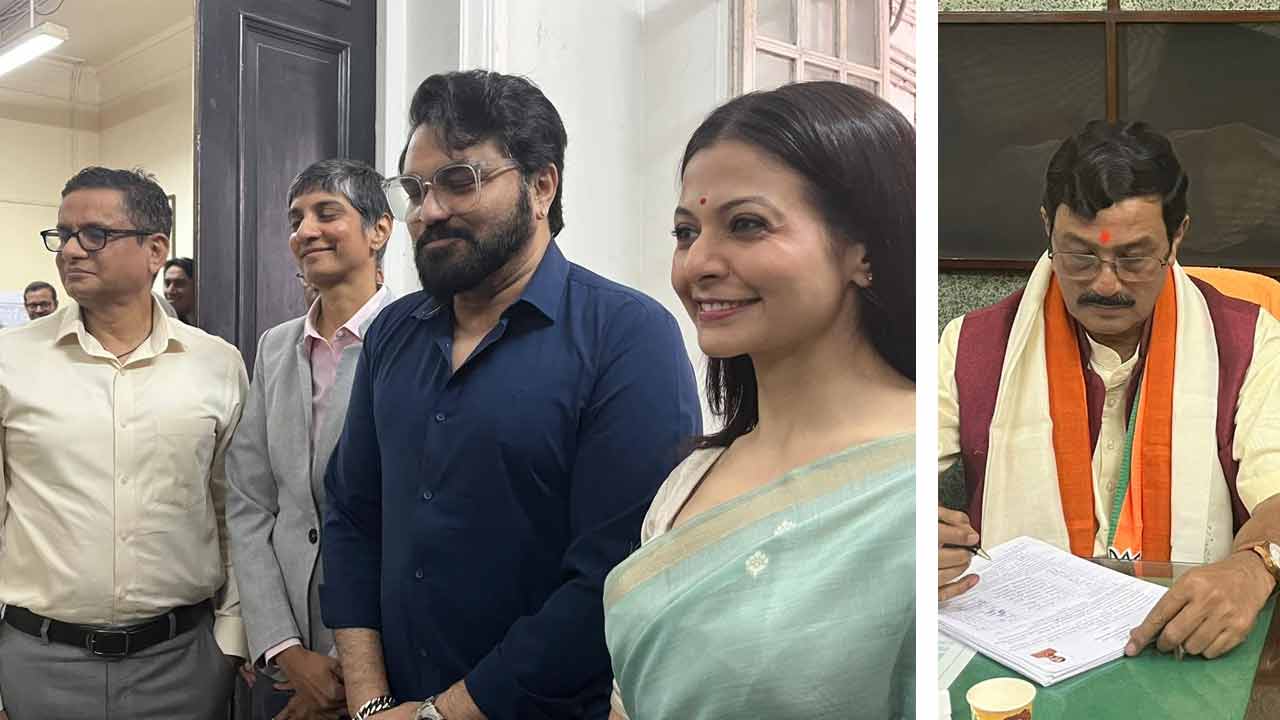 মনোনয়ন জমা দিলেন (বাঁ দিকে) রাজীব কুমার, মেনকা গুরুস্বামী, কোয়েল মল্লিক এবং বাবুল সুপ্রিয়। রাহুল সিংহ (ডান দিকে)। বৃহস্পতিবার বিধানসভায়। —নিজস্ব চিত্র।