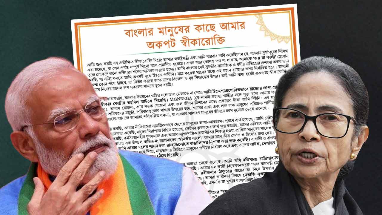 প্রধানমন্ত্রী নরেন্দ্র মোদীর বয়ানে পশ্চিমবঙ্গের মানুষের উদ্দেশে লেখা চিঠি প্রকাশ করল তৃণমূল। তাতে বাঙালি নির্যাতন, রাজ্যকে আর্থিক বঞ্চনা-সহ অন্তত পাঁচটি বড় ‘স্বীকারোক্তি’ রয়েছে। সম্পূর্ণ চিঠিটাই লেখা হয়েছে মোদী সরকারকে খোঁচা দিয়ে। তৃণমূল সমাজমাধ্যমে এই চিঠি প্রকাশ করে লিখেছে, ‘‘যে চিঠি নরেন্দ্র মোদী কোনও দিন লিখবেন না।’’