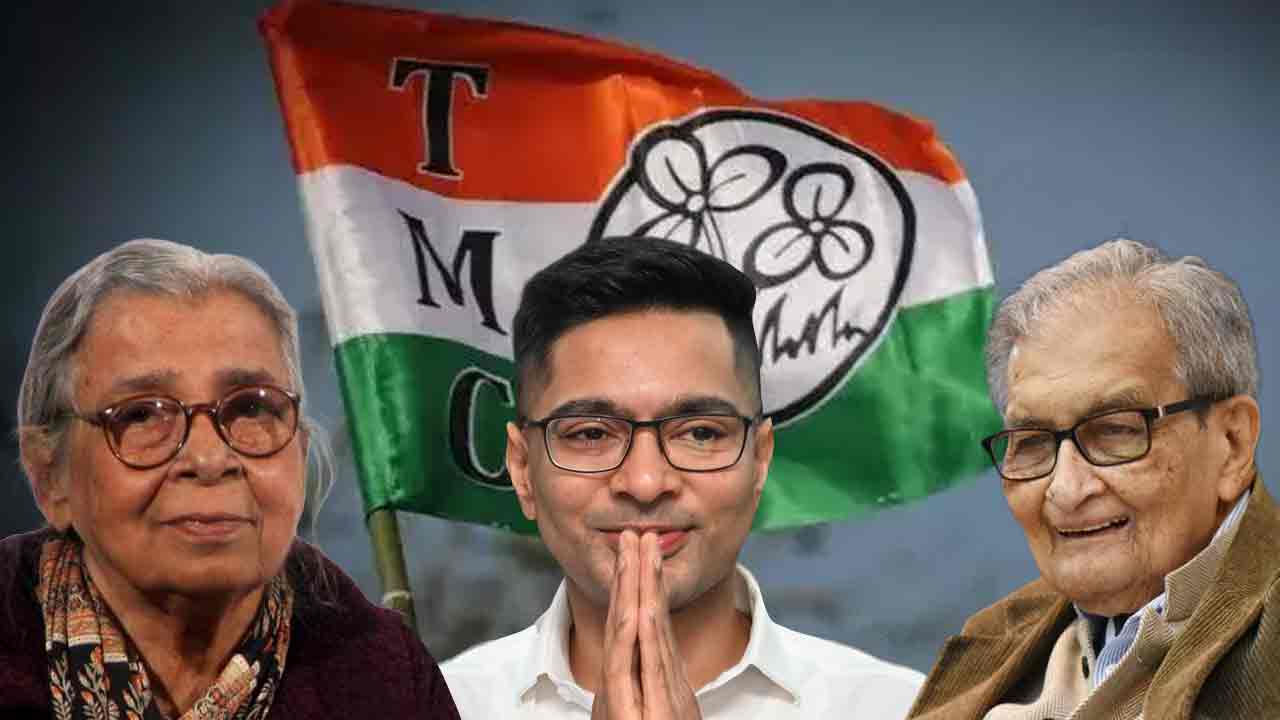 (বাঁ দিকে থেকে) মহাশ্বেতা দেবী, অভিষেক বন্দ্যোপাধ্যায় এবং অমর্ত্য সেন। গ্রাফিক: আনন্দবাজার ডট কম।