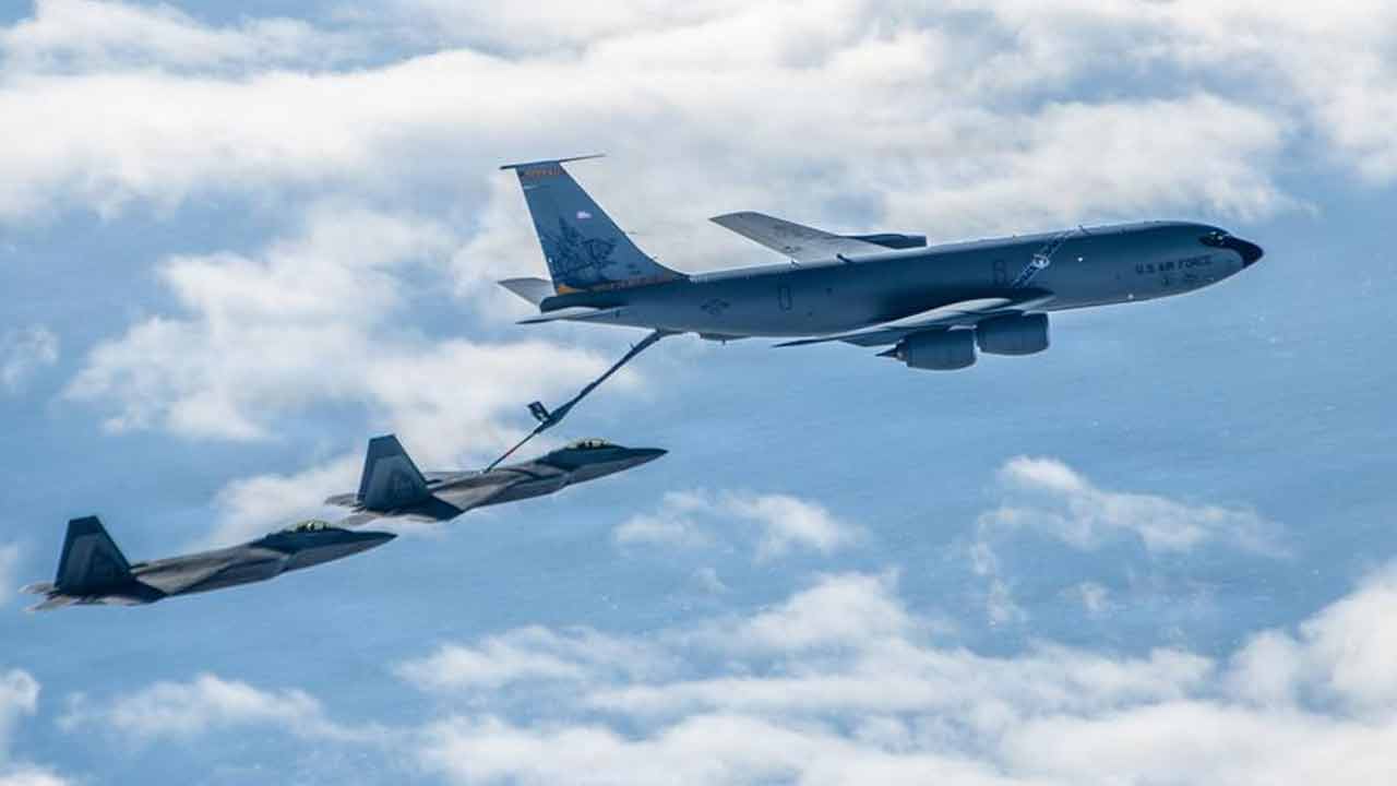 মাঝ-আকাশে যুদ্ধবিমানে জ্বালানি ভরার মার্কিন বায়ুসেনার বিমান। প্রতিনিধিত্বমূলক ছবি।