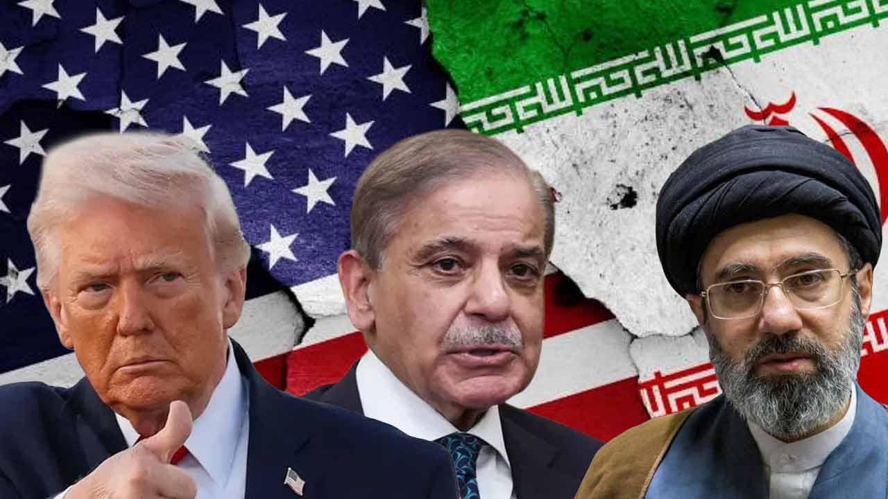(বাঁ দিক থেকে) আমেরিকার প্রেসিডেন্ট ডোনাল্ড ট্রাম্প, পাকিস্তানের প্রধানমন্ত্রী শাহবাজ় শরিফ এবং ইরানের সর্বোচ্চ নেতা মোজতবা খামেনেই। গ্রাফিক: আনন্দবাজার ডট কম।