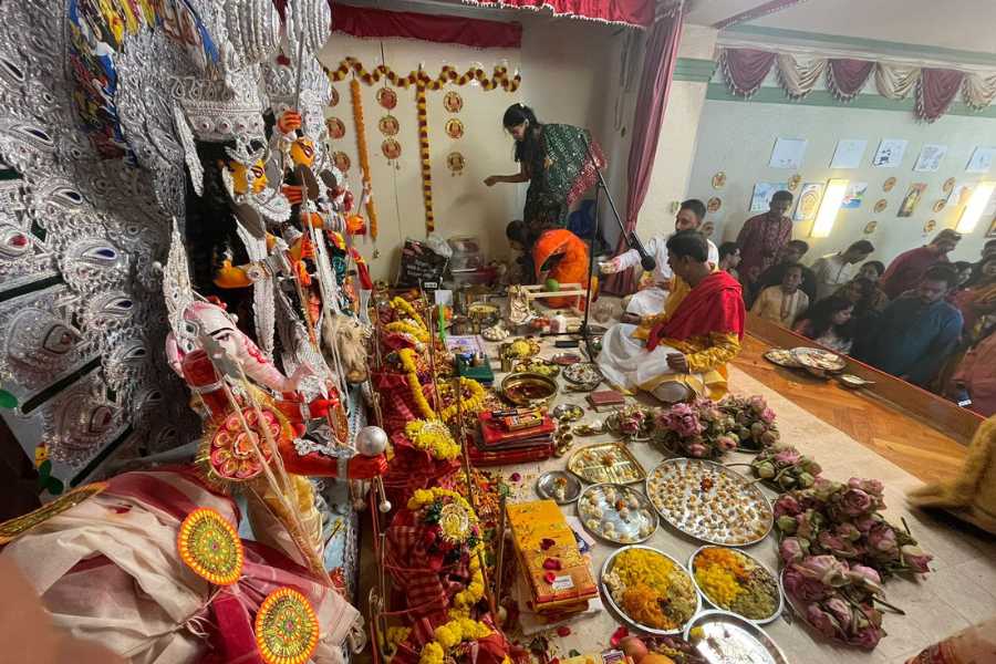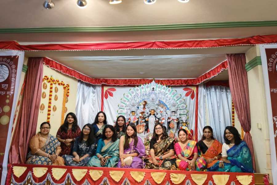 আমাদের এই পুজোর আদল বনেদি বাড়ির চণ্ডী মণ্ডপ। সাবেকি ডাকের সাজে, এক চালার দুর্গা প্রতিমা অপরূপময়ী। এই বার তৈরি করা হয়েছিল সাড়ে সাত ফুট উচ্চতা আর সাড়ে ছয় ফুট প্রস্থের প্রতিমা। বিদেশের মাটিতে এই কাজ সহজ ছিল না। বিভিন্ন রকম প্রতিকূলতা, আবহাওয়ার খামখেয়ালিপনা সামলে হাতে হাতে রেখে এই অসম্ভবকে সম্ভব করেছি আমরা।